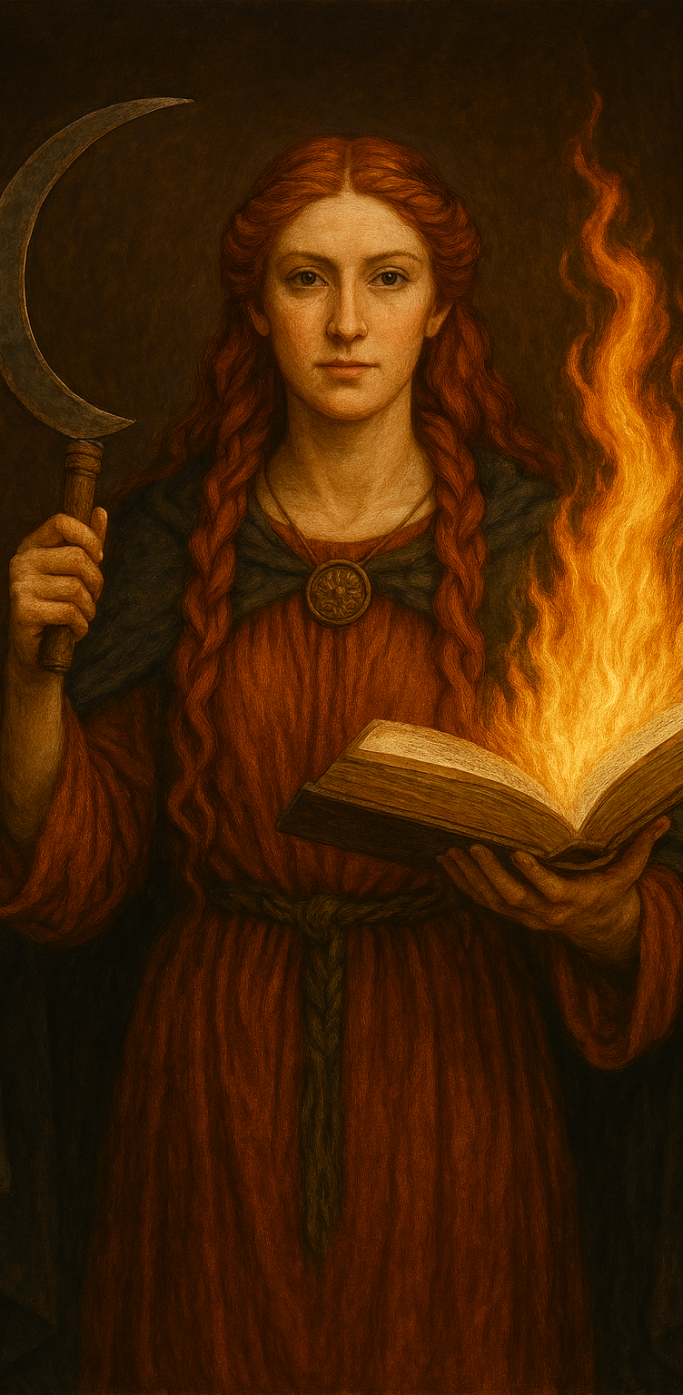 - Feuer und Sichel: Brigid wird oft mit einem heilenden Feuer und dem Symbol der Heilkraft dargestellt.